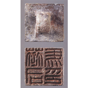 This bronze seal is cast with a brigedshaped ornamental knob. The inscription is carved in negative relief with the characters Chu Sima Yin. Sima was the title of a senior Chu miitary official. A pproximately 200 bronze seals were found in Shizishan bearing inscriptions indicating she titles of court officials, military officials and county officials who served for the Chu kingdom.