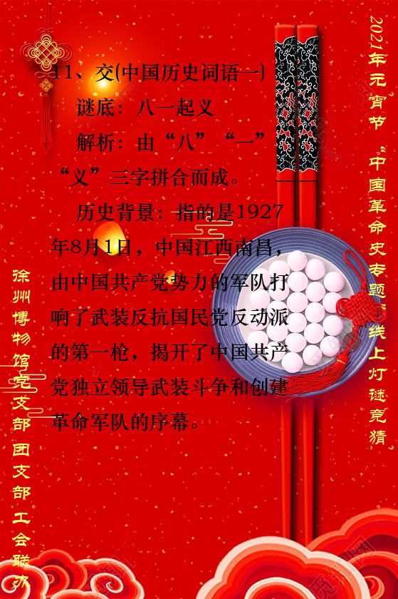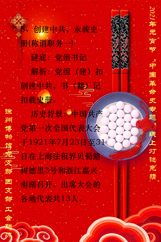 為慶祝中國(guó)共產(chǎn)黨成立100周年,響應(yīng)黨中央關(guān)于開(kāi)展黨史學(xué)習(xí)教育的號(hào)召,值此元宵佳節(jié)到來(lái)之際,2021年2月22日下午,徐州博物館黨支部、團(tuán)支部和工會(huì)聯(lián)合舉辦了“中國(guó)革命史專題”線上有獎(jiǎng)猜燈謎活動(dòng)。