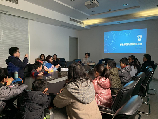 然后,老師給小朋友們介紹了戰(zhàn)國的兵器發(fā)展并給小朋友講述了戰(zhàn)國時期趙國推行騎射的歷史故事,幫助小朋友們了解戰(zhàn)爭中兵種的變化。