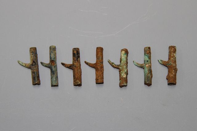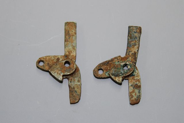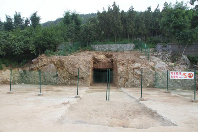 墓室為狹長型長方形洞室,長11.6米、北端寬3.2、高2.26米,南端寬1.9、高1.4米。墓室開鑿不甚規整,北端頂部近平頂,中部以南頂部呈弧形,愈往里端愈向內斜收,且底部愈高隆,頂部愈低矮。墓室底部及壁面多突兀不平,在部分低凹、裂隙處均以紅褐色純土或夾雜紅燒土塊抹平。墓室北端頂部、兩壁及地面鑿有三道封門石槽,由墓室口殘存的褐色漆木朽痕推測,原有木質門板封堵。在墓室中部殘存棺漆痕跡及少量墓主骨骼,骨骼僅見少許盆骨、肢骨,可基本斷定棺槨位置之所在。該墓因盜擾嚴重,隨葬器物多已無存,孑遺者其原始位置已不明確。隨葬器物多為車馬器、兵器類,以明器為主。車馬器有蓋弓帽、銜鑣、車轙等,兵器主要有弩機、箭鏃、鐵戟等。