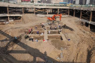 蘇寧廣場城市綜合體為徐州市政府城建重點(diǎn)工程,位于徐州市區(qū)彭城路以東,河清路以南,淮海路以北,解放路以西,占地面積4萬多平方米。項(xiàng)目所處位置為徐州市老城中心,已被劃為徐州市重點(diǎn)文物埋藏區(qū),根據(jù)文獻(xiàn)記載和歷年來在徐州市老城區(qū)的發(fā)掘收獲,蘇寧廣場古遺址有豐富的文物遺存。因此自2012年8月蘇寧廣場工程基坑土方開挖以來,徐州博物館持續(xù)進(jìn)行了搶救性考古發(fā)掘,發(fā)掘采用隨工清理和探方清理兩種辦法,實(shí)際發(fā)掘面積約600平方米(圖版一,B區(qū)探方)。